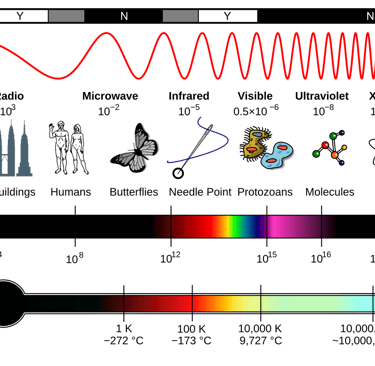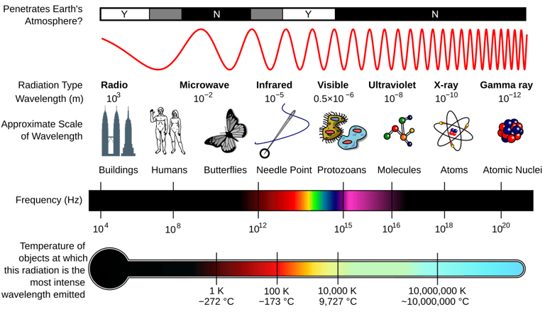 The part of light we can actually see is called the visible spectrum. Shorter wavelengths look blue or violet—go even shorter and you get ultraviolet, which we can’t see. Longer wavelengths appear red, and beyond that is infrared, also invisible to us.