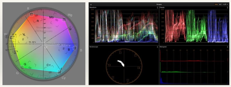 Colorists also rely on scopes, like the waveform and vectorscope. These tools give you a visual readout of color and brightness, so you’re not just going by what your eyes are saying—which, as we now know, can be influenced over time. And finally, they take breaks. Giving your eyes a chance to rest and reset helps you come back with a clearer, more accurate view of the scene.