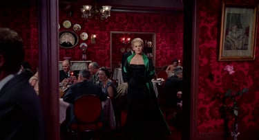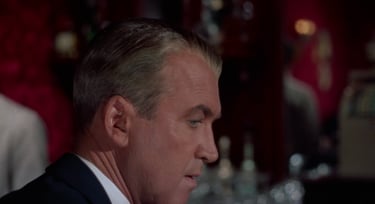 Now, what about the all-knowing storyteller—the one who sees more than any character ever could? A great example of this is in Hitchcock’s Vertigo. In one scene, the main character, detective John Ferguson, is spying on a woman he’s become obsessed with. He’s sitting at a restaurant bar, watching as she finishes dinner with another man. When they get up to leave, John tries to blend in and stay unnoticed. But then, she stops right behind him.