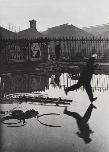 There’s a story about Bresson walking the streets of Paris, like he often did, hunting for that perfect moment. He walked past a construction site surrounded by a tall wooden fence. In the fence, there was a small hole. He stuck the lens of his 35mm camera through that hole and snapped a photo. That image—of a man mid-leap over a puddle, just before landing—became one of his most famous shots.